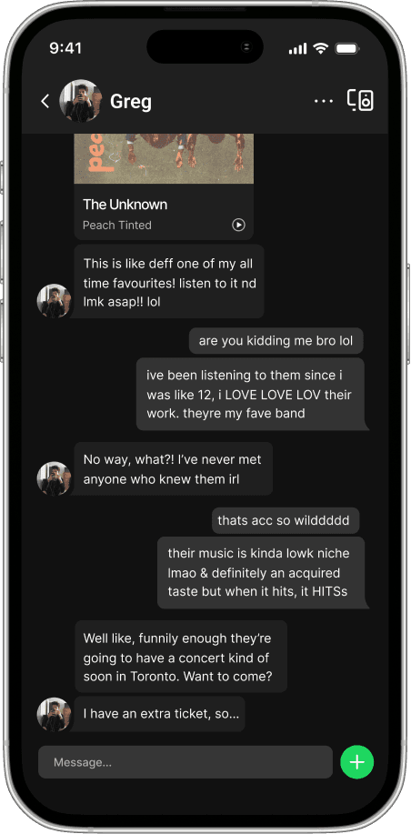 Despite new social features, sharing music on Spotify still requires leaving the app. This adds friction to a core behavior and limits engagement around music.
